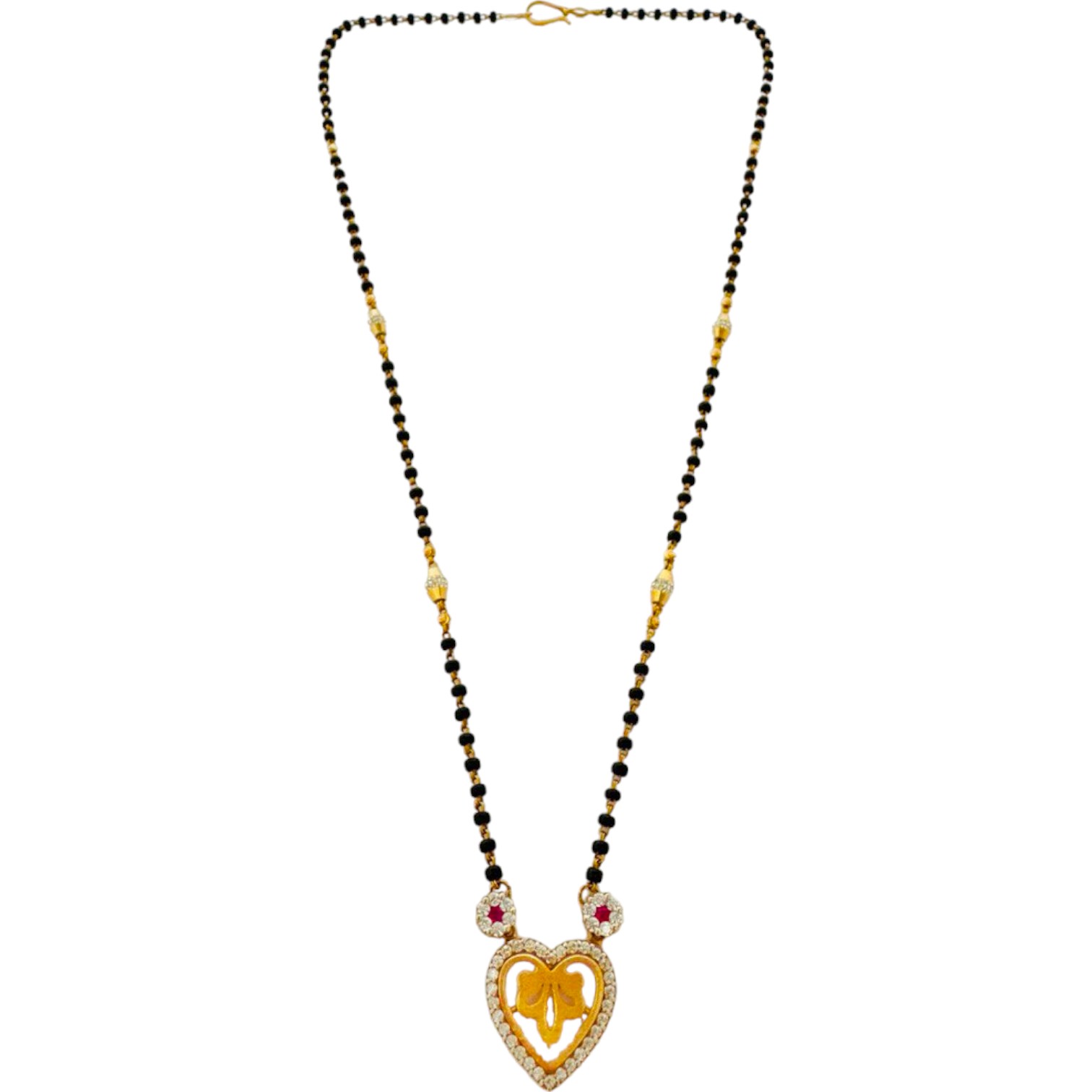 This exquisite jewelry piece, often a necklace, gracefully combines the warm, romantic hues of rose gold with the striking boldness of black beads. The rose gold’s soft, pinkish tone, derived from a blend of gold and copper alloys, offers a luxurious yet delicate backdrop. In contrast, the black beads, possibly made from onyx, jet, or other materials, add a touch of sophisticated drama. This combination creates a versatile accessory, perfect for both traditional and modern attire. Its allure lies in the contrast—where timeless elegance meets bold, modern simplicity.